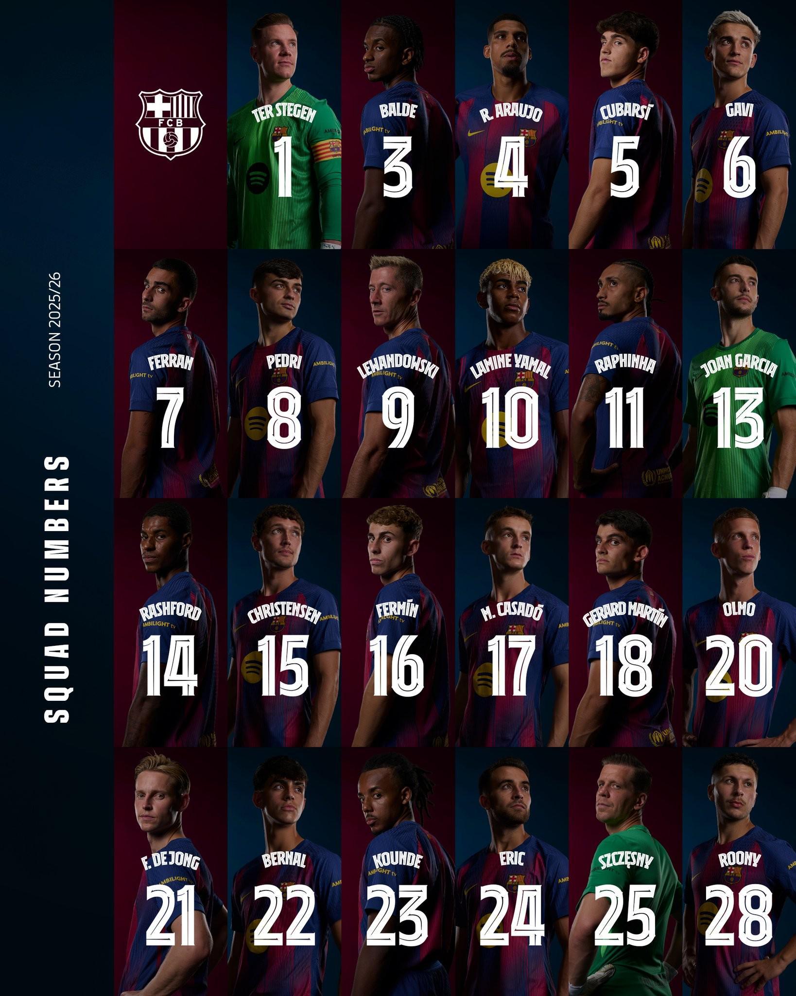 巴萨新赛季号码:特尔施特根1号,亚马尔10号,巴尔德吉28号
